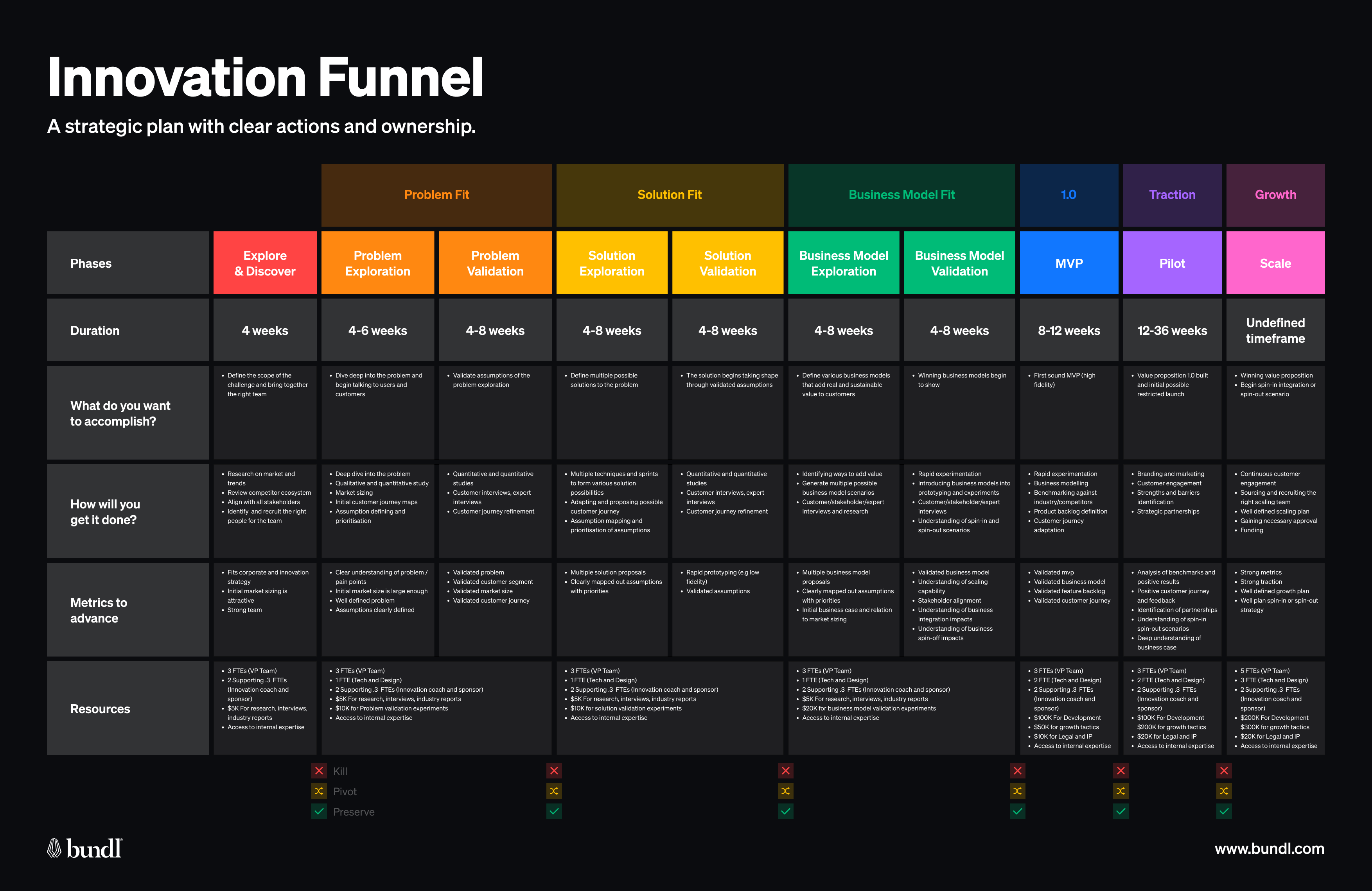 The goal of this step is to create a framework and process to bring your new value proposition to life. Our innovation funnel tool is a great way to get started on things like clearly defining your phases, establishing your timeline, identifying your KPIs, and setting up your metrics of success.