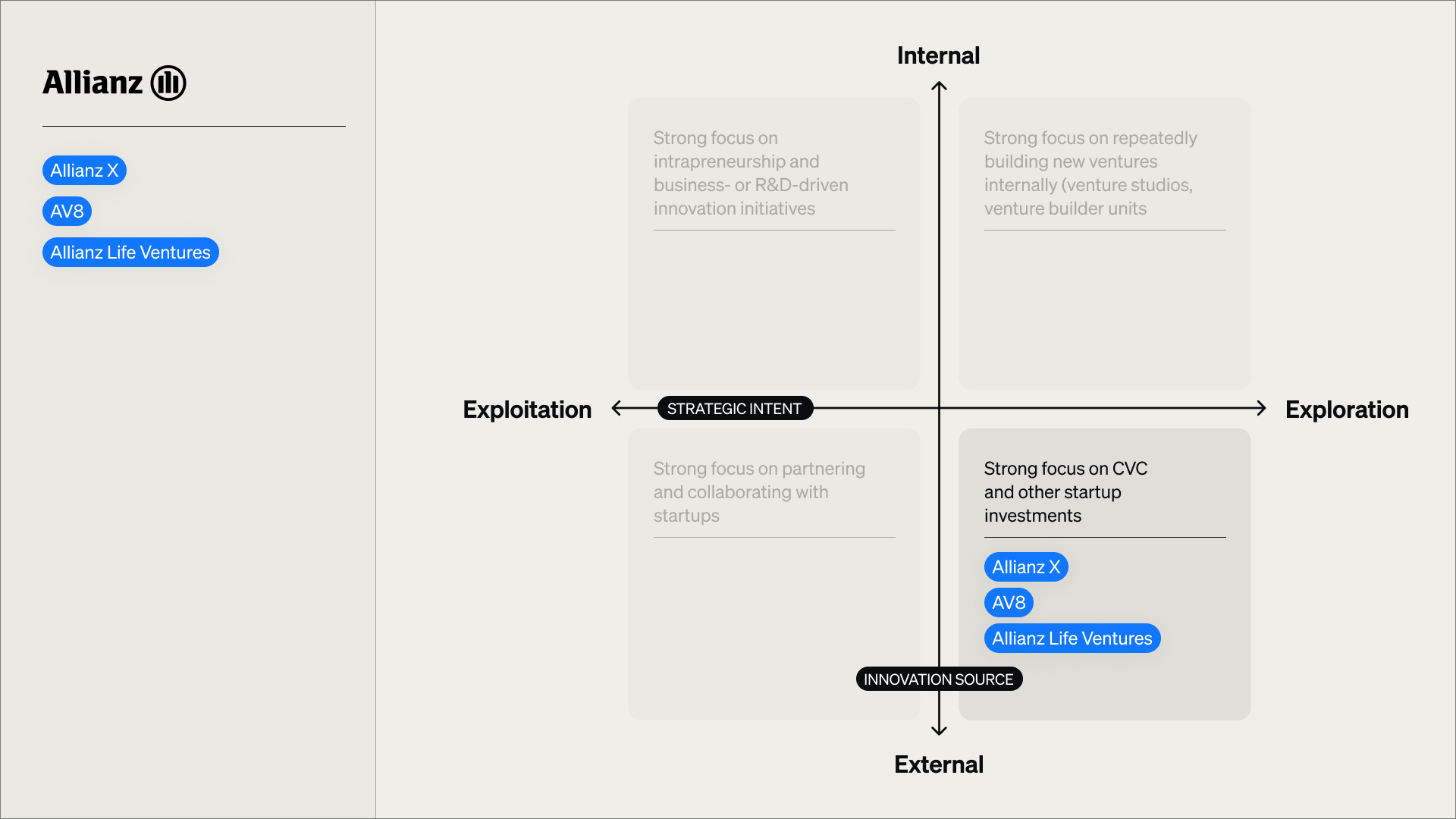 - Fragmented focus: Allianz X invests in external startups primarily from a financial perspective, with little evidence of a broader strategic or innovation-driven intent.