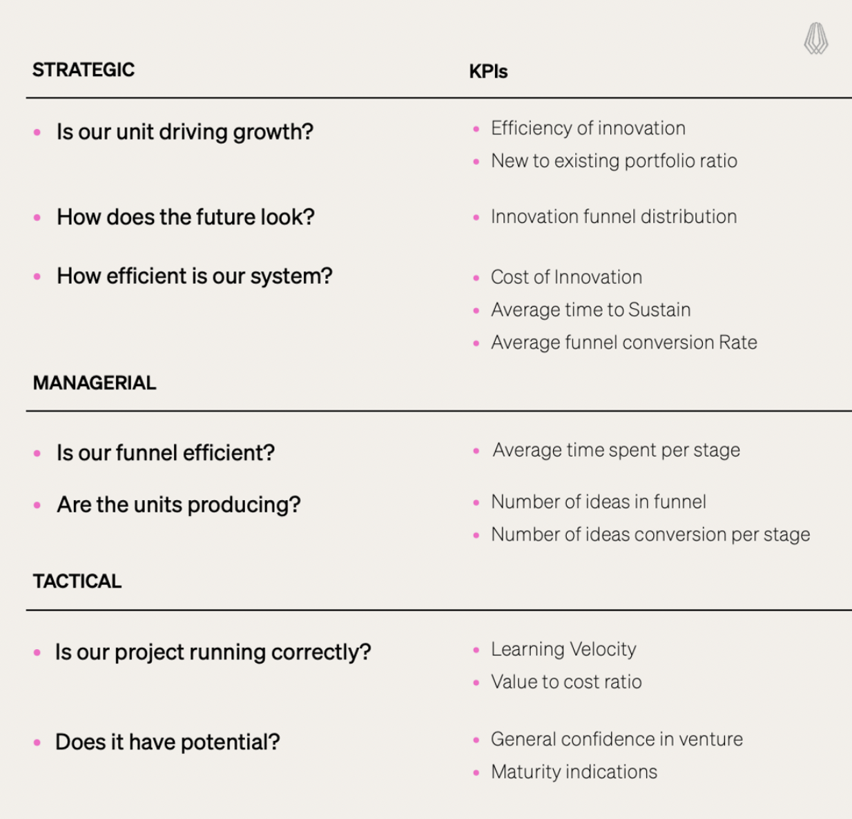 To track the progress of the incubator, it's essential to define a set of innovation metrics and incubation milestones. It’s also crucial to keep in mind that you’ll be managing innovation efforts, not financial returns. With that goal in mind, here are a few of the questions and KPIs you should consider: