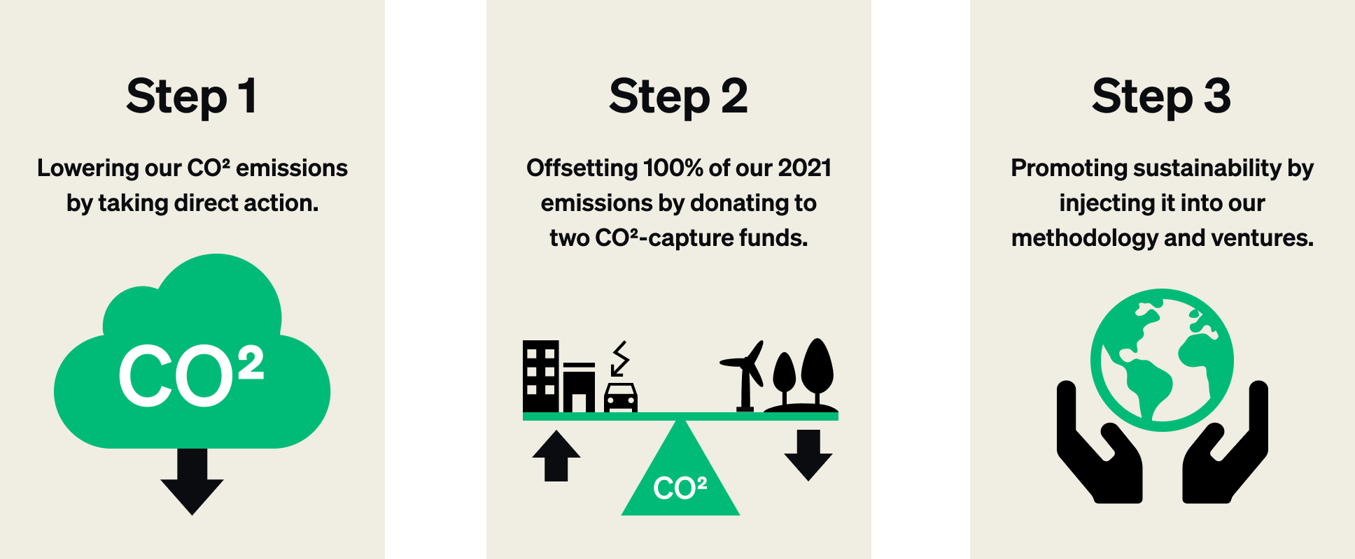 Finally, as corporate venture builders, we also have a considerable environmental impact by ideating, co-creating, and launching new corporate ventures. Not only are we invested in creating ventures and services that help our customers reach their growth goals - we’re also increasingly factoring sustainability into the equation.