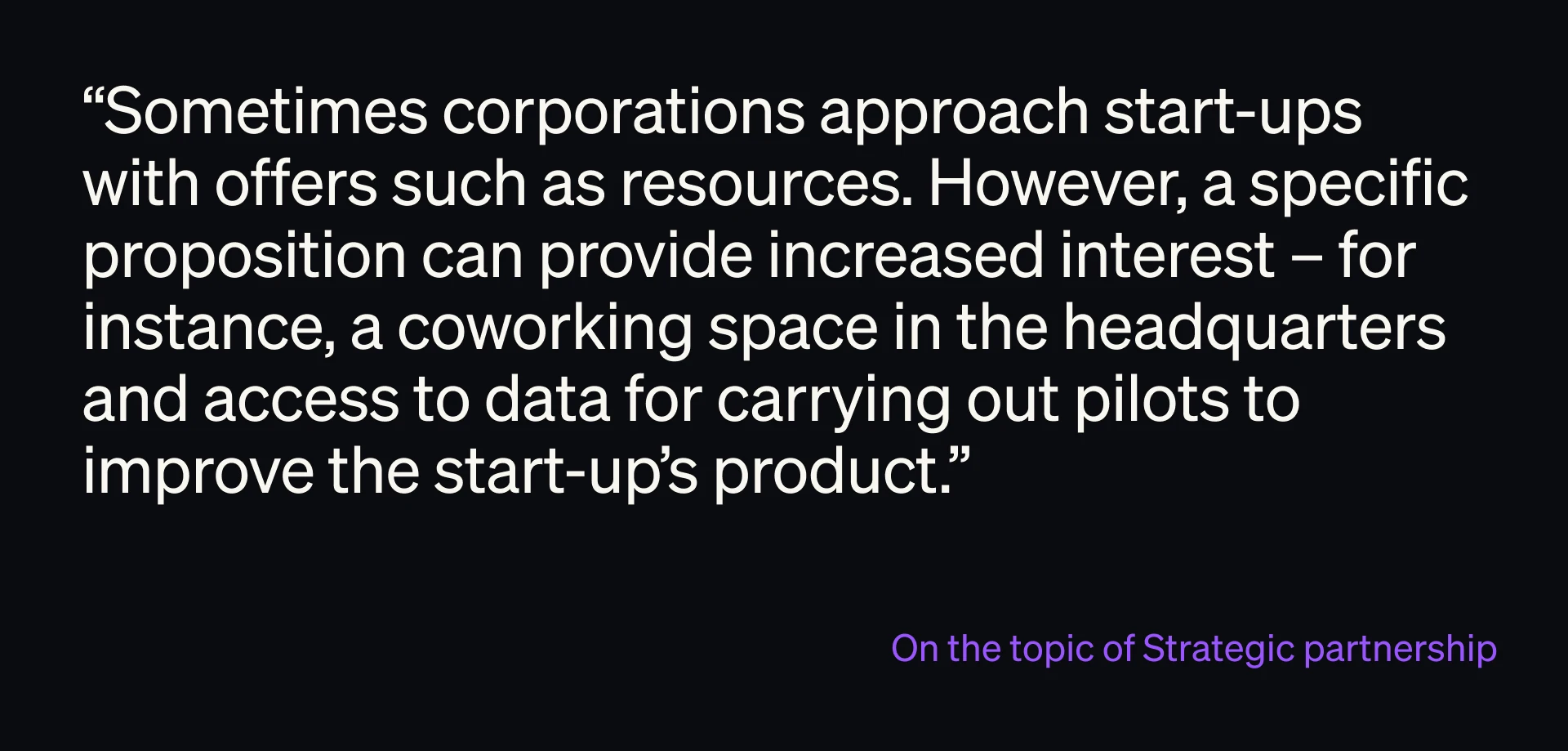 The first step? Put yourself in the startup’s shoes. When crafting your VP, keep in mind that startups tend to prioritise partners that can provide crucial growth resources like market access, technical expertise, industry/customer insights, development tools or boost their reputation in the market through brand association. Your VP should also be clear and tangible, as explained in this study from IESE Business School: