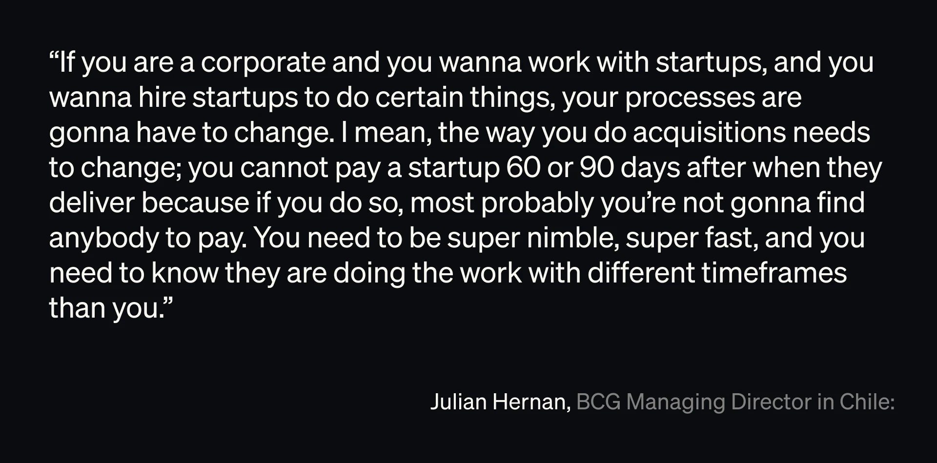 Startups are all about speed. Delays are costlier for them because they often have limited resources. That’s why Corporates that take steps to speed up their processes and internal bureaucracy have a better chance of successfully engaging them. As explained by Julian Hernan, BCG Managing Director in Chile: