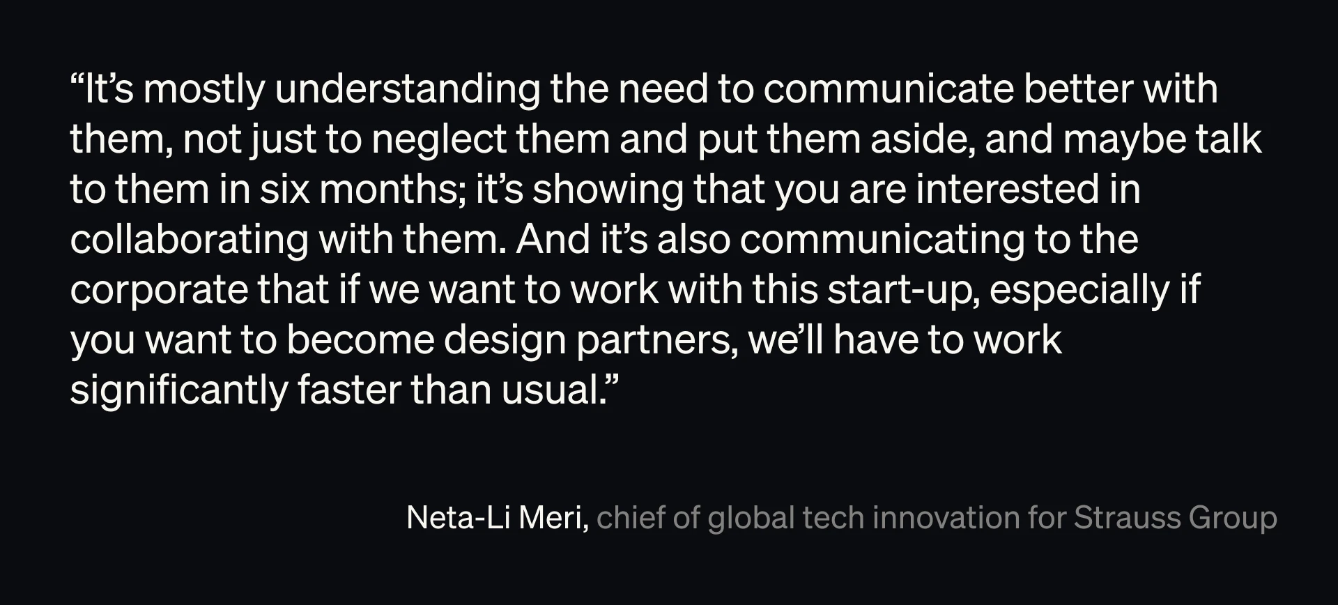Open and transparent communication is key. Make sure you clearly convey your corporate’s perspective, growth goals, decision-making process, timeline and more. It’s also important to really understand the needs of the startup and communicate how you can effectively meet them. As explained by Neta-Li Meri, chief of global tech innovation for Strauss Group: