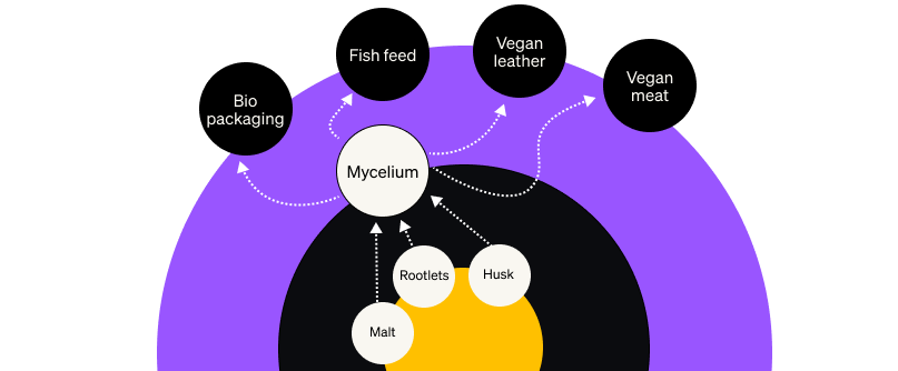 Continuing on the example above, a little research will reveal that your malt, rootlets and husks can be turned into “mycelium”, the rootlike structure of a fungus that can be used to make bio-packaging, fish-feed, vegan leather, and vegan meat.