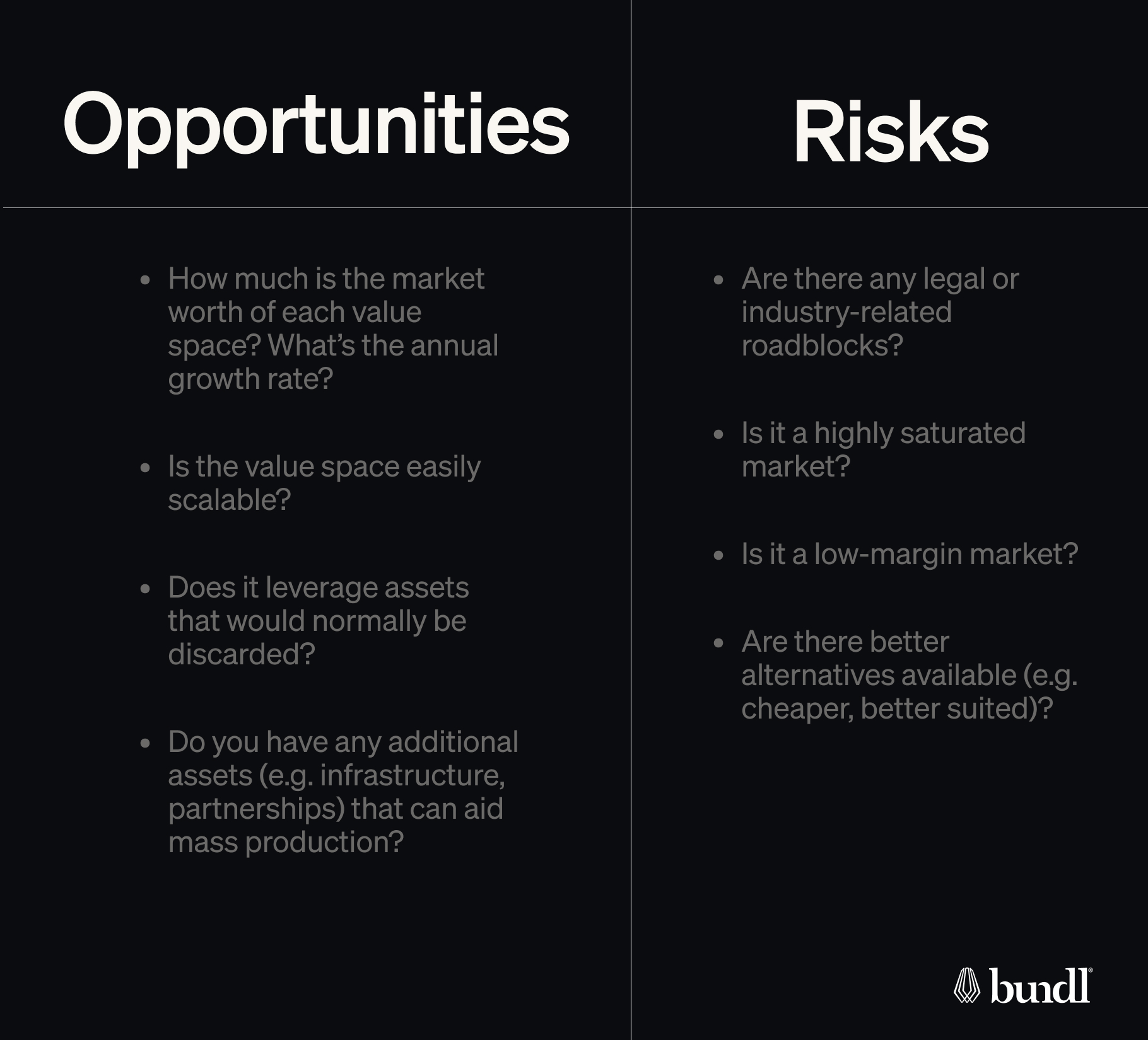 Now that you’ve identified a few new value spaces, it’s time to take a closer look at each one and identify some of the key opportunities and risks associated with each. Here are just a few examples of the questions you could ask: