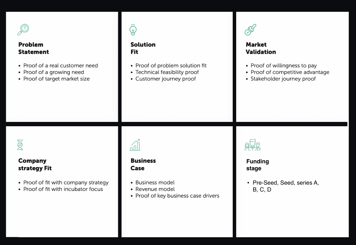 When choosing startups to collaborate with, it's helpful to have clear criteria that align with your corporation's objectives and goals. Some of the factors to consider when deciding the criteria to use, include: