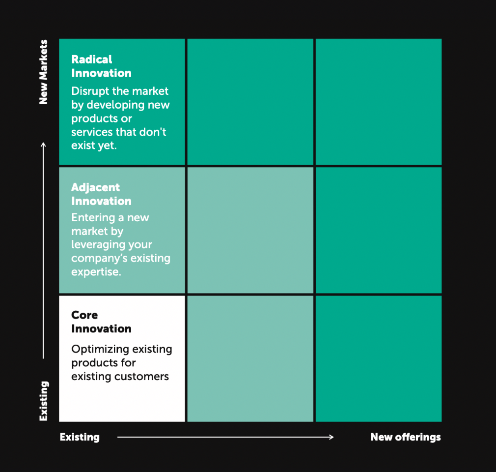 To optimise the effectiveness of your corporate-startup collaboration, it's essential to determine the scope of the engagement. This involves deciding how close or far the collaboration should extend from your current markets and offerings. In general, collaborations can be categorised into three types of innovation: core, adjacent, and radical.