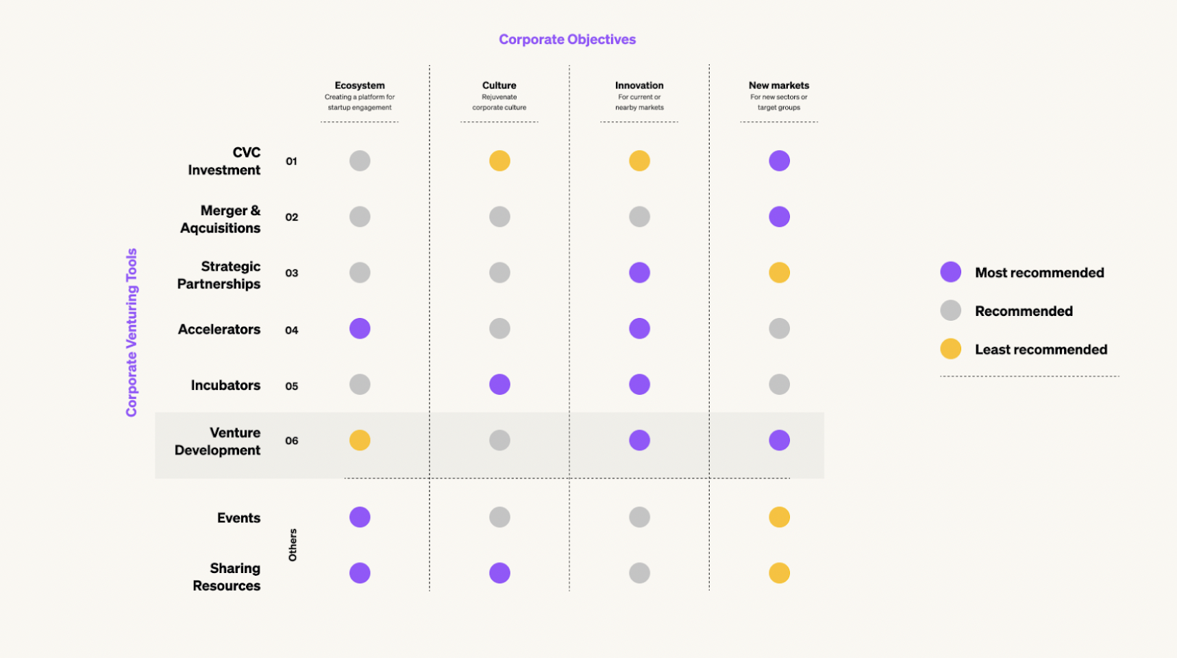 If your goal is to venture outside your core business, stick with models aimed at seeking out new sectors or target groups, like CVC, M&A, and venture development studios.