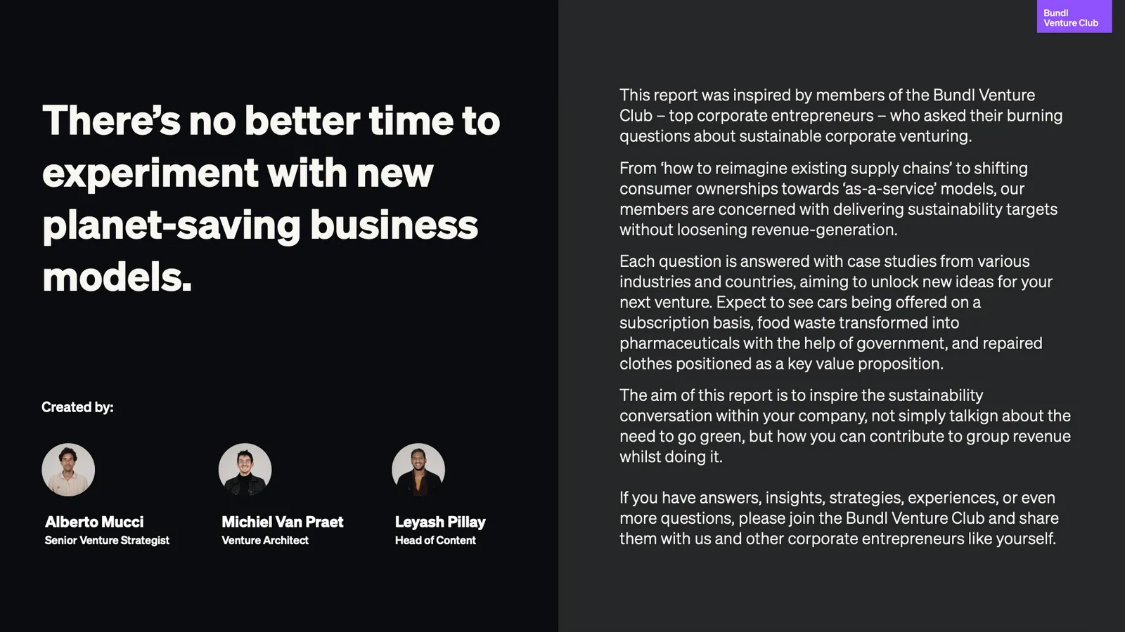 We asked Bundl Venture Club members – corporate entrepreneurs from around the world – what their biggest sustainability challenges are. They came back with seven key questions. Each has been answered with case studies to showcase the possibilities in this space and inspire your next venture track.
